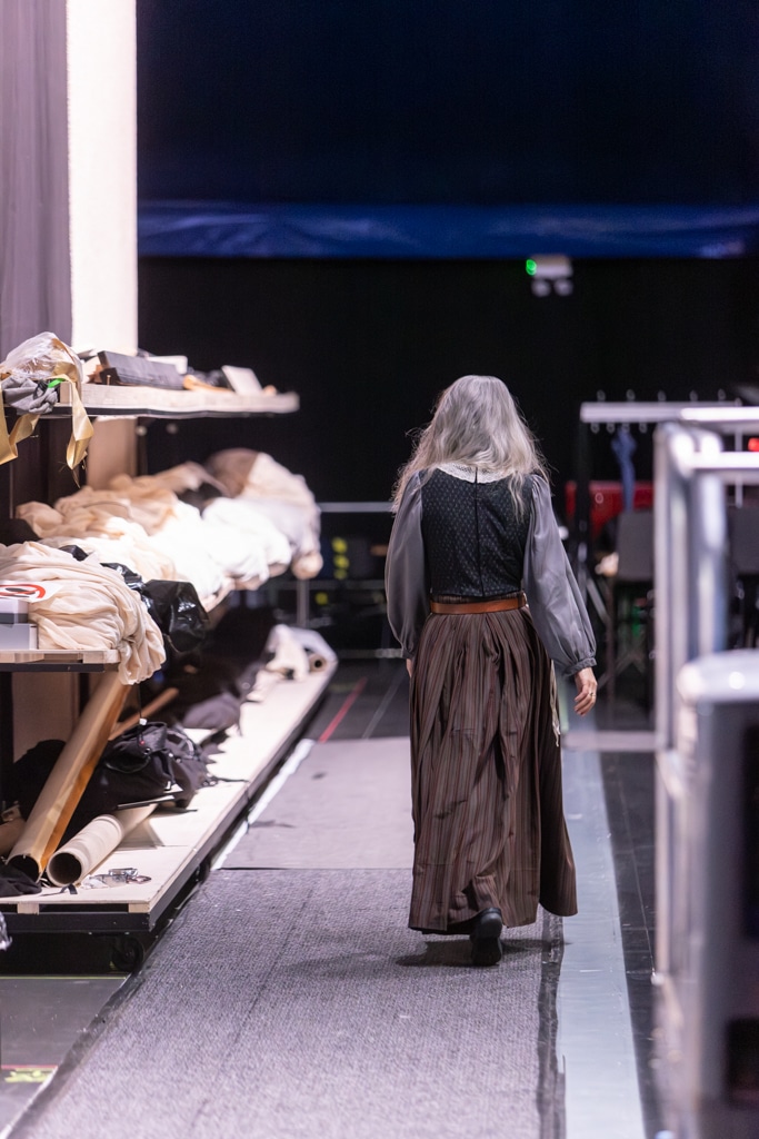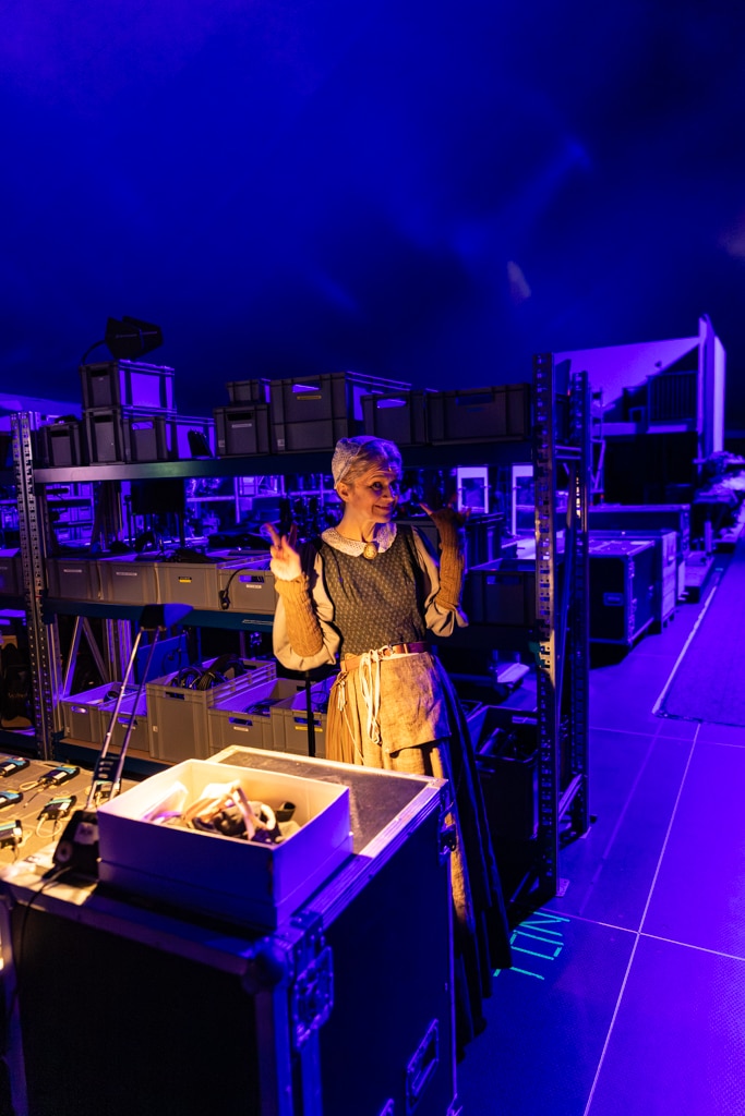 Da wird auf der Seitenbühne, die aufgrund fehlender Gassenverkleidungen völlig einsehbar ist, nach Requisiten gesucht, kurz noch einmal mit dem Klavierauszug eine schwierige Stelle geübt oder sich mit Entspannungsübungen auf den nächsten Auftritt vorbereitet. Die Darstellerin der Gouvernante allerdings kann im Verlauf der Vorstellung zunehmend weniger zwischen Fiktion und Realität unterscheiden, sodass die beiden Erzählebenen im Finale der Oper schließlich kollidieren.