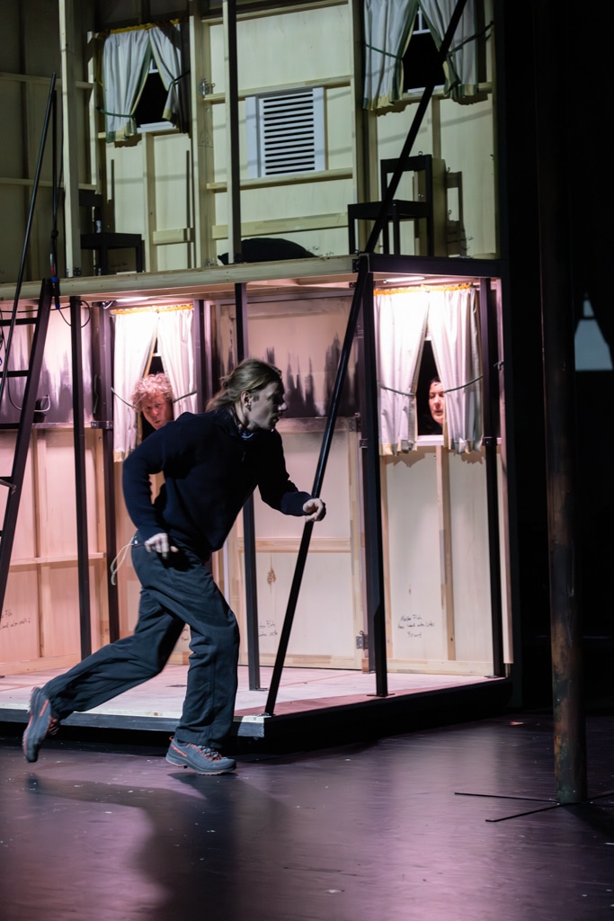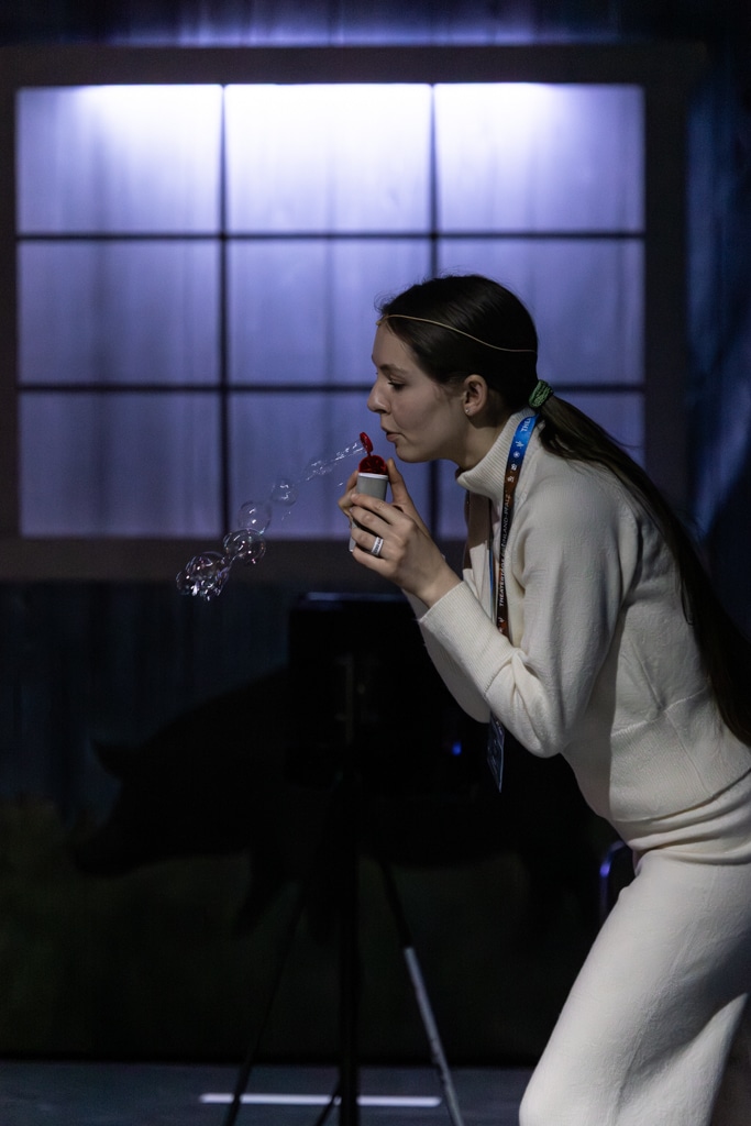 Als Dank für seine Hilfe erhält Peregrinus von Meister Floh ein Gedankenmikroskop – eine Mischung aus Lügendetektor und Gedankenlesegerät, das Peregrinus helfen soll, zu wissen, was die Menschen um ihn herum wirklich denken. Das will der junge Mann natürlich direkt ausprobieren und geht in einer der amüsantesten Szenen des Abends in den Zuschauerraum. Er hält den Apparat nun an zufällig ausgewählte Personen im Publikum, deren vermeintliche Gedanken dann zu hören sind. „So ganz kann ich der verwirrenden Handlung ja nicht mehr folgen“, verkündet er die Gedanken einer Zuschauerin. „Mist, ich habe vergessen heute noch meine Mutter anzurufen“, die eines anderen. Ein ziemlich nützliches Instrument, so ein Gedankenmikroskop, oder? Das Gelächter im Publikum nach dieser Sequenz ist groß – und verschafft den Zuschauer:innen die Möglichkeit, die bisher dargestellte Geschichte etwas sacken zu lassen.