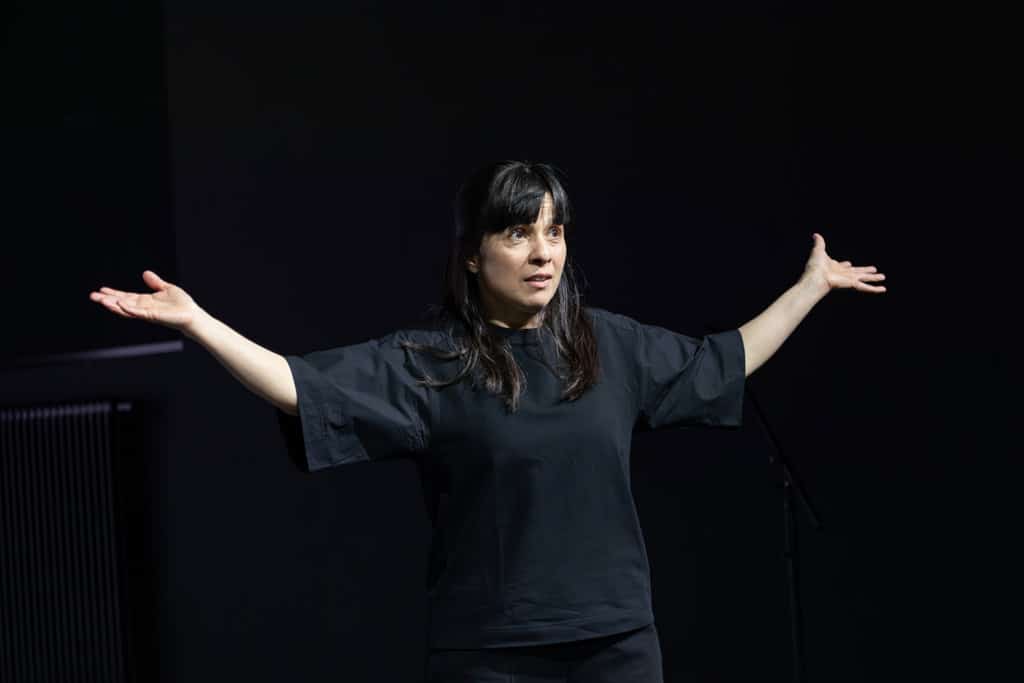 Als ich mich mit der Dramaturgin Juliane Wulfgramm darüber unterhalte, dass der innere Monolog wegfällt, obwohl er das wesentliche Element des Romans ist, sagt sie: „Dann hätten wir auch eine Lesung machen können.“ Das trifft es perfekt. Ein innerer Monolog ist kein Theaterstück. Die Gedanken, die wir uns machen, könnten wir durchaus aussprechen, wenn nur jemand die entsprechenden Fragen stellen würde. So weit weg ist das also nicht. Die richtigen Fragen stellt die übergroße Leinwand, wenn die Protagonistin am Ende eines Gedankenstrangs angekommen ist. Ist das schon Dialog oder nur die Quasi-Fleischwerdung der nächsten Frage, die man sich an dieser Stelle einer gewissen Logik folgend stellen würde? Auch das spielt eigentlich keine Rolle, denn für mich als Zuschauerin ist entscheidend, dass ich folgen kann. Zu viel meta macht müde, zu plump und verursacht offensichtlich Augenrollen.