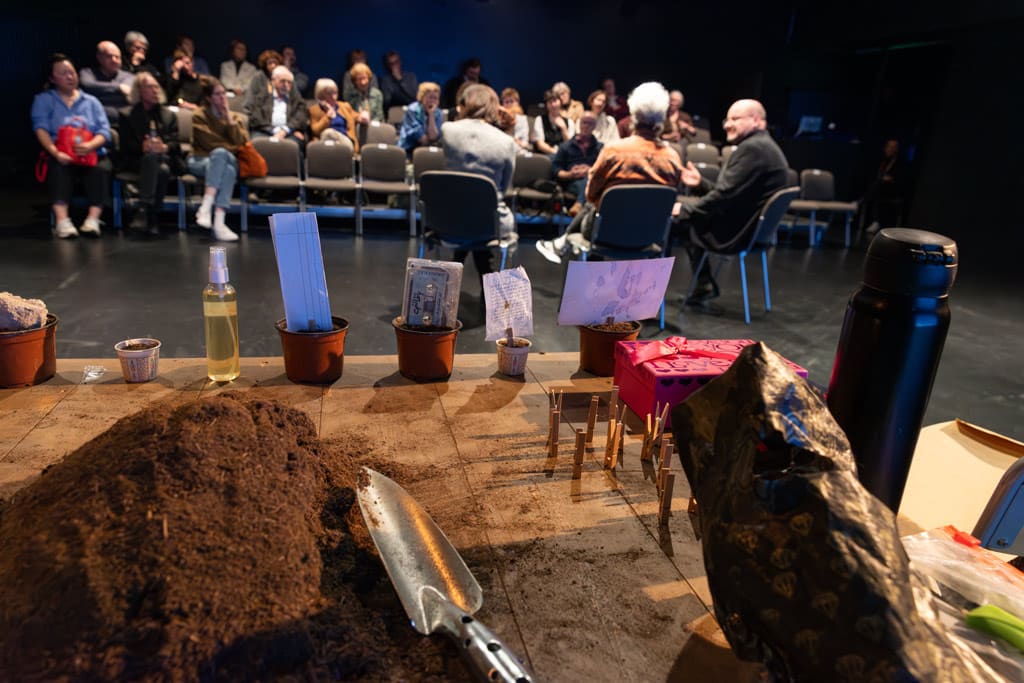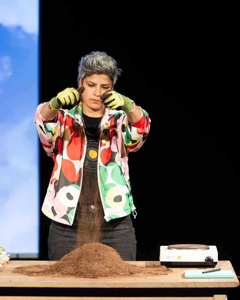 „Die Welt geht unter und ich mach Salat“, ist eine von Mleihis Aussagen, die in diesem Kontext besonders nachhallen. Auch in ihrer parallelen Live-Performance konzentriert sich die Künstlerin auf das Alltägliche. Man sieht sie an einem Tisch, wie sie Kaffee kocht. Sie betrachtet das Publikum, verschwindet für längere Zeit von der Bühne. Sie breitet Gartenerde auf dem Tisch aus und füllt sie in Blumentöpfe.
