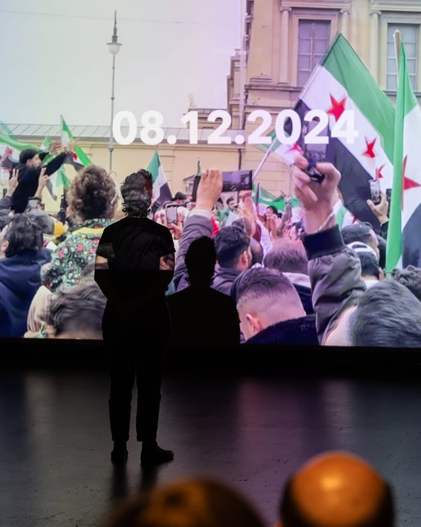 Zunächst sitzt die Autorin mit dem Rücken zum Publikum und starrt auf eine große Leinwand. Dort erscheinen Szenen vom 8. Dezember 2024, dem Tag, als das Assad-Regime in Syrien gestürzt wurde. Die Bilder von Menschen, die auf den Straßen feiern, Statuen, die umgeworfen werden, und Porträts des ehemaligen Machthabers, die in Flammen aufgehen, gingen um die Welt. Mleihi bietet in ihrer Performance allerdings einen viel persönlicheren Zugang, als er dem deutschen Publikum durch dessen Blick von außen sonst möglich wäre.