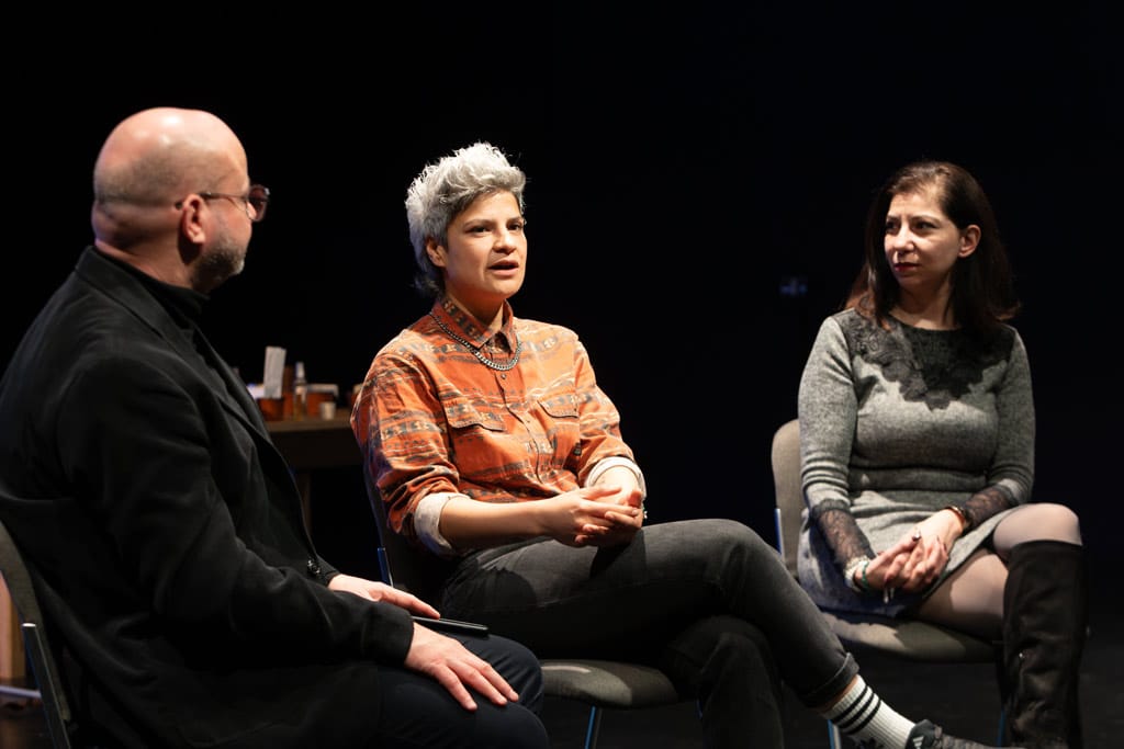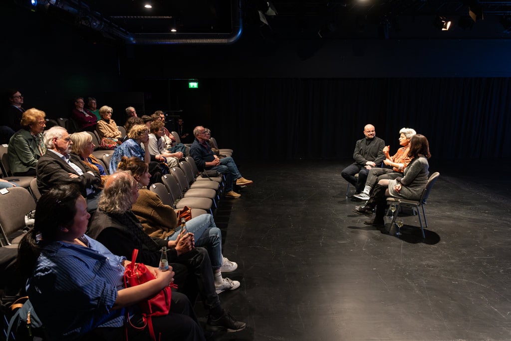 Entsprechend verzichtet der Abend auf eine künstlich erzwungene Belehrung und gibt stattdessen einen ebenso realistischen wie packenden Einblick in die Welt einer syrischen Künstlerin, die seit zehn Jahren in Deutschland lebt. „Ich habe meine Wahrheit erzählt – ohne Scham“, erklärt Mleihi im Nachgespräch, bei dem das Publikum Hintergründe zur Produktion erfuhr und der Autorin Fragen stellen konnte. Selbst sehr persönliche und schmerzhafte Themen, wie das Schuldgefühl in Deutschland ein sicheres Leben zu führen, während die Familie noch in Syrien ist, werden in Mleihis Schilderungen nicht ausgespart.